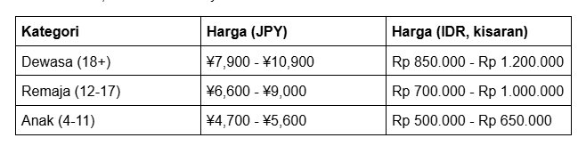 Harganya sekitar Â¥1,500âÂ¥2,500 per wahana (sekitar Rp160.000âRp270.000), tapi sangat worth it kalau kamu cuma punya waktu 1 hari.